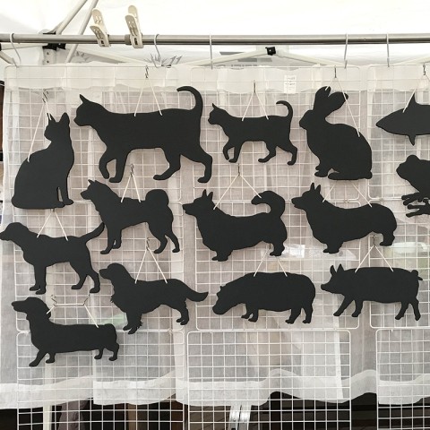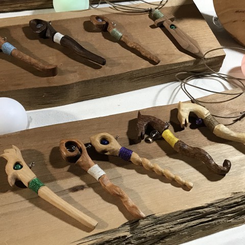 小枝のアロマペンダント、動物シルエットの黒板やブローチ、魔法の杖など、