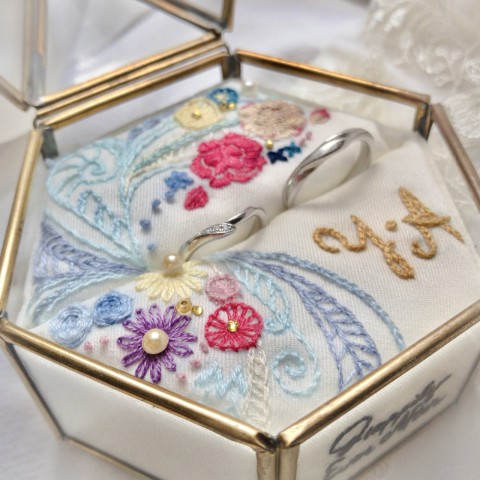 リングピローをはじめとする刺繍ウェディングアイテムを販売中です。