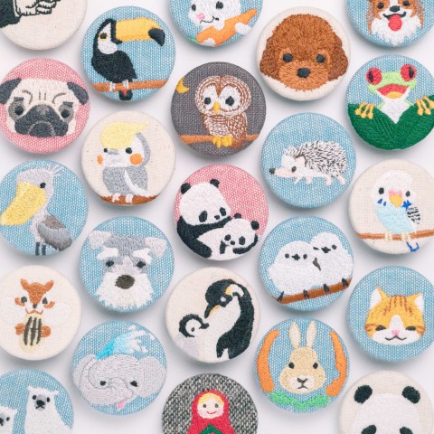 パンダが一生懸命アルファベットを表現してる「もじパンダ」、刺繍くるみボタンブローチやスカーフリングなど、くるみボタン雑貨も販売いたします。