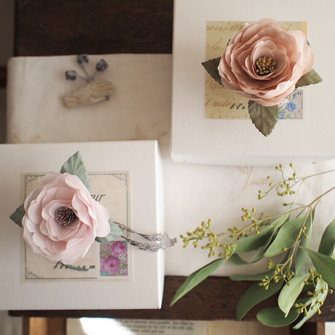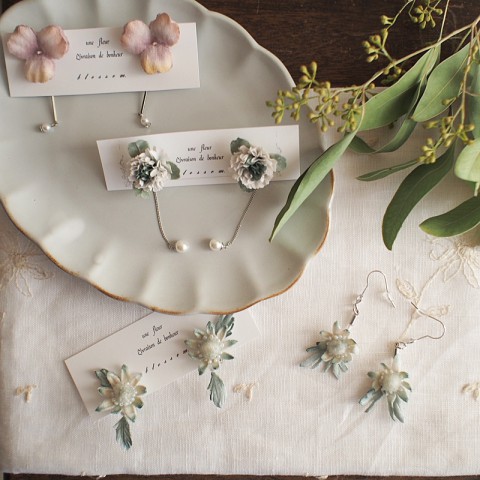 ニュアンスのある色合いに手染めした”布花コサージュ”&"布花アクセサリー”を、立体感を大切に繊細な雰囲気の佇まいを表現してます。