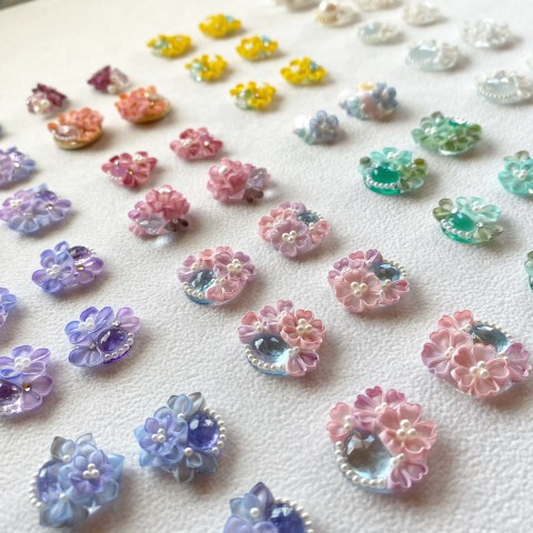妓さんのかんざしに使われる伝統技法つまみ細工と、天然石やガラスを組み合わせて、透明感のあるアクセサリーを制作しています。花びら1枚1枚に色付けをしているので、そのほとんどが1点ものです。
