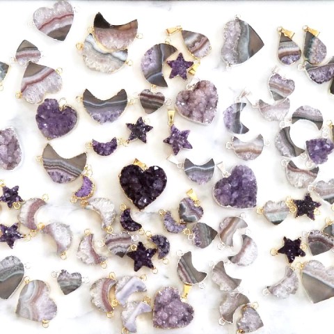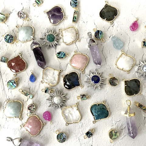 当店では天然石を使ったアクセサリーパーツの販売をしております。一般的には天然石と言えば丸玉のビーズですがそれだけではなく海外では大人気のドゥルージーを使用したパーツ、アメジストを切り出して作製したパーツなどなど…