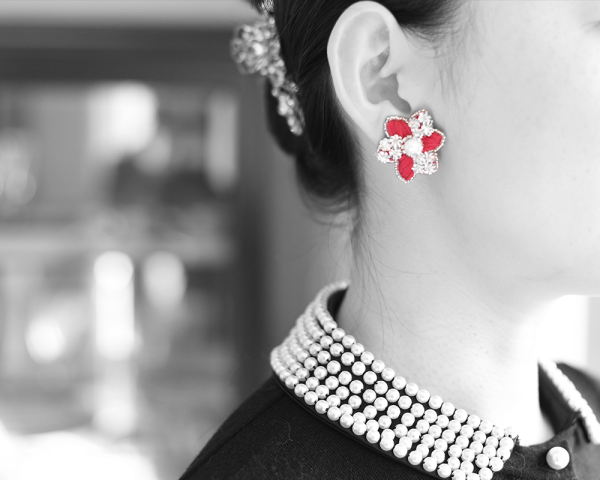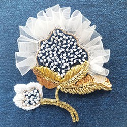 制作は、リュネビル刺繍とマントゥーズ刺繍というオートクチュール刺繍の技法を用いて、糸、ビーズ、スパンコールなど様々な素材を組み合わせて行っています。