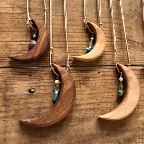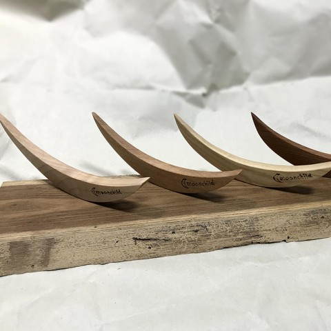 様々な樹種を生かして作る木の三日月のアクセサリーをメインに、お月さまの一輪挿しやカッティングボード、