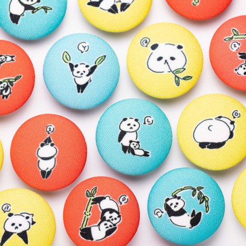 パンダが一生懸命アルファベットを表現してる「もじパンダ」、刺繍くるみボタンブローチやスカーフリングなど、くるみボタン雑貨も販売いたします。