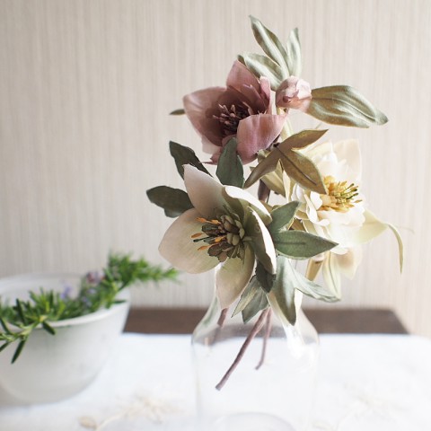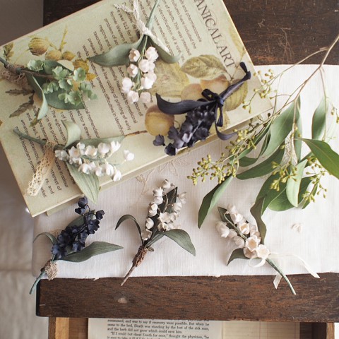 ニュアンスのある色合いに手染めした”布花コサージュ”&"布花アクセサリー”を、立体感を大切に繊細な雰囲気の佇まいを表現してます。