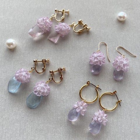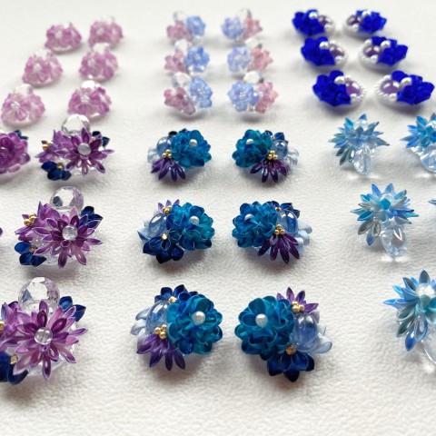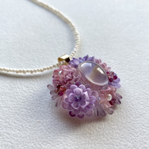 妓さんのかんざしに使われる伝統技法つまみ細工と、天然石やガラスを組み合わせて、透明感のあるアクセサリーを制作しています。花びら1枚1枚に色付けをしているので、そのほとんどが1点ものです。
